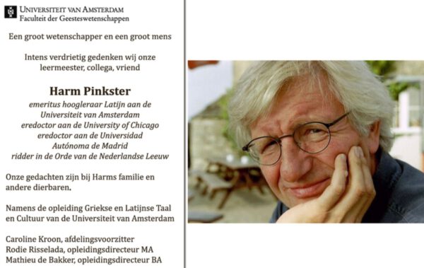 Afgelopen week bereikte ons het verdrietige bericht dat Harm Pinkster, warm mens en groot vakgenoot is overleden. Zijn naam zal voor altijd verbonden zijn aan het gymnasiale onderwijs vanwege "zijn" woordenboek Latijn, waarmee een hele generatie is opgegroeid.